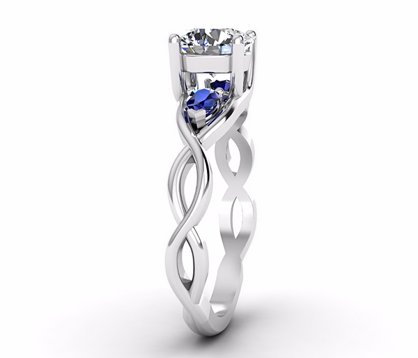 Round white sapphire and pear shape natural blue sapphire engagement ring. Ring :-Metal: 14K White Gold-Center Gem: Natural White Sapphire-Shape: Round-Size: 1.00 carat -Color: White-Quality: AA-Side Gems: Natural Blue Sapphires-Shape:...