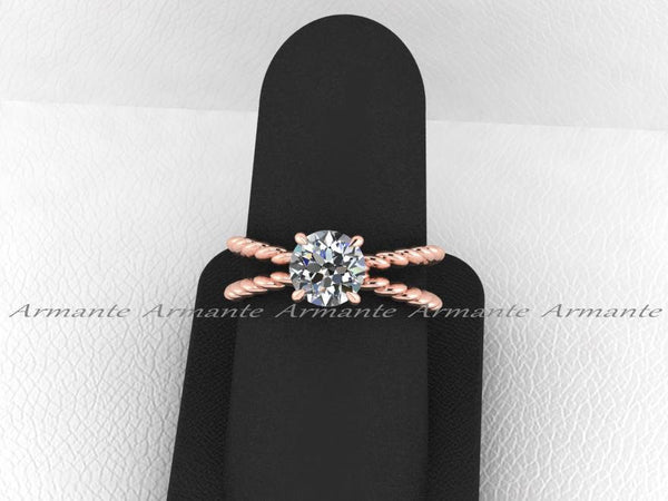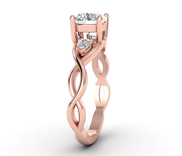 Forever Brilliant Moissanite Rose Gold Engagement Ring. This is a modern twisted crossover solitaire ring, the tapered four prong basket is showcasing a popular round Charles Colvard Moissanite as center...