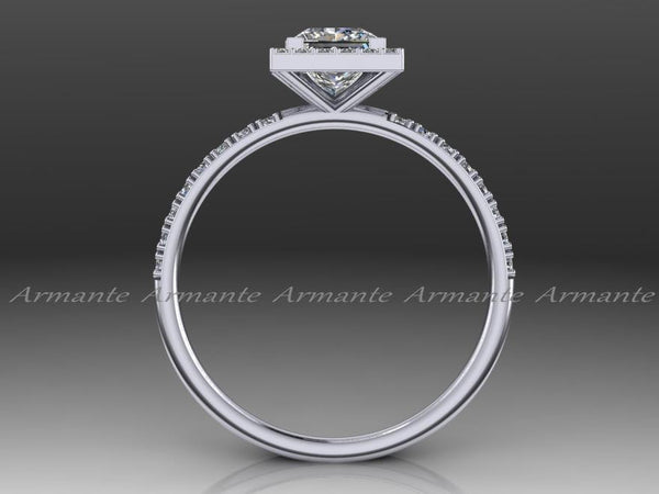 1.00 carat Princess Cut Moissanite and natural conflict-free diamond Engagement Ring. This gorgeous 14K white gold Halo Engagement Ring has delicately set micro pavé diamonds and a V prong set...