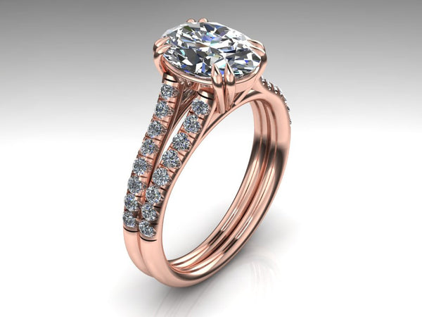 Best of best, 9x7mm Oval Forever One Moissanite center gem and 32 French pave set natural conflict-free diamonds, that pass half way down on the 18K rose gold stylish split...