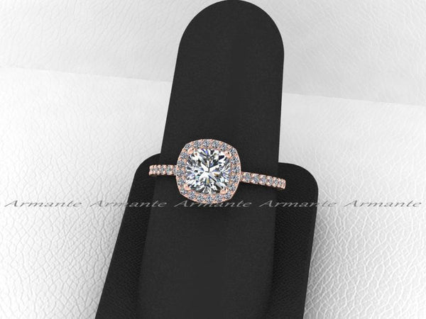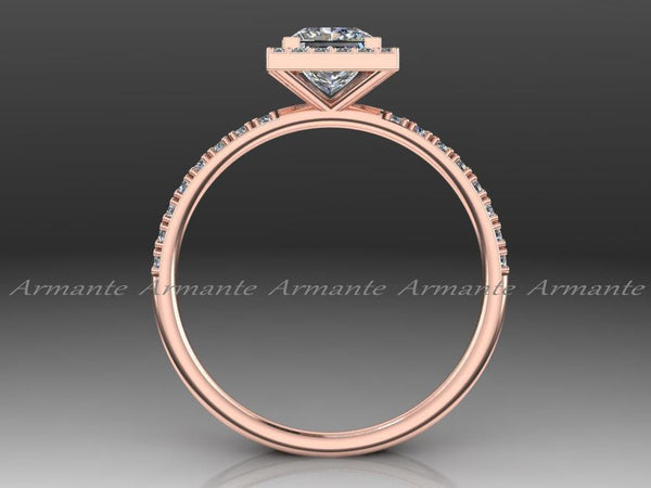 14K Rose Gold 1.00 carat Princess Cut Moissanite and .21 carat natural conflict-free diamond Engagement Ring. This gorgeous Halo Engagement Ring has delicately set micro pavé diamonds and a V...