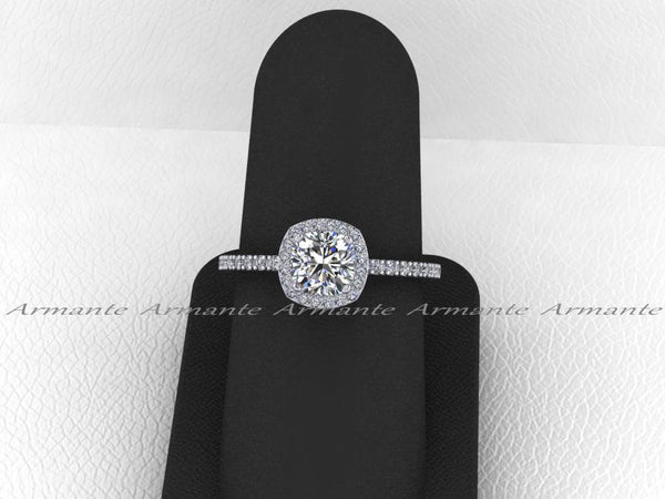 Forever One Moissanite Platinum Diamond Halo Engagement Ring. Colorless beauty, 1.10 carat Cushion cut forever ONE Charles Colvard Moissanite center gem, the accent gems are micro pavé set fine VS...