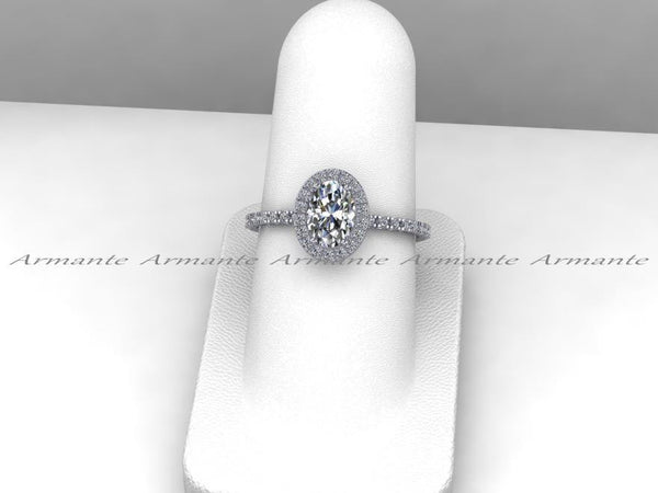 Oval Moissanite Engagement Ring. Petite Halo Diamond and Moissanite Engagement Ring. The center is a 7.00 x 5.00mm Oval Brilliant Charles Colvard Moissanite, the accent gems are micro pavé set...